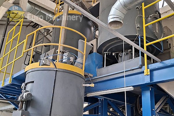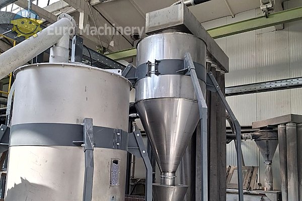 Ligne complète de recyclage et de repelletisation du PET comprenant l’extrudeuse EREMA VACUREMA 1512 T ecoSAVE avec des sécheurs de cristallisation intégrés, des systèmes de vide et un granulateur de brins sous l’eau. Cette installation certifiée par l’EFSA assure un traitement efficace des matériaux avec environ 21 000 heures de fonctionnement et est en bon état.