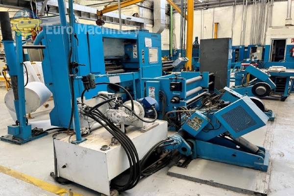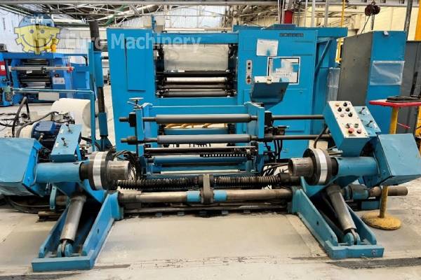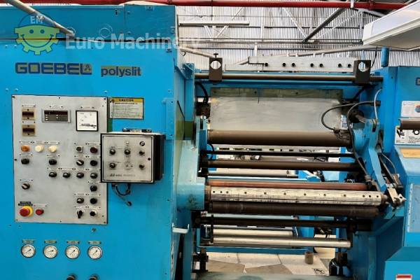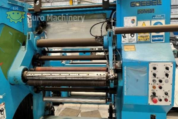 GOEBEL Bobineuse découpeuse polyslit pour couper l’aluminium, le film et le papier. Cette machine de refendage peut couper de 50 mm à 800 mm, vitesse de travail 800 m/min. Marque et modèle : GOEBEL POLYSLIT Matériau à découper : Aluminium, film, papier Largeur de coupe : Min 50 mm – max 800 mm Épaisseur min-max : 0,009 – 0,051 mm Dérouleur :- Diamètre maximal du rouleau : 1.100 mm