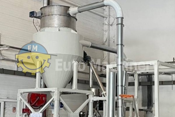 Le microniseur Periplast MP500 pour PP, PE, PS, ABS, PA, APET, PMMA permet d’alimenter des matériaux broyés de 6 à 10 mm et de les microniser à 250 – 600 μm, avec un rendement allant jusqu’à 400 kg/h. Marque et modèle : Periplast MP500 500mm Matériau pouvant être traité : Indiqué pour la micronisation de PP, PE, PS, ABS, PA, APET, PMMA ; Application : Le matériau est introduit à grande vitesse au centre d’un ensemble de disques fixes et d’un ensemble de disques rotatifs, la force centrifuge amenant le matériau micronisé sur la ligne de convoyage ; Production : Alimentation en matériau concassé de 6 à 10 mm et sa micronisation à 250 – 600 μm ; Rendement : Jusqu’à 300 – 400 kg/h, selon le matériau Puissance installée : 55 kW 7,5 kW Parties principales et accessoires :- Trémie d’alimentation en acier inoxydable avec alimentateur vibrant ;